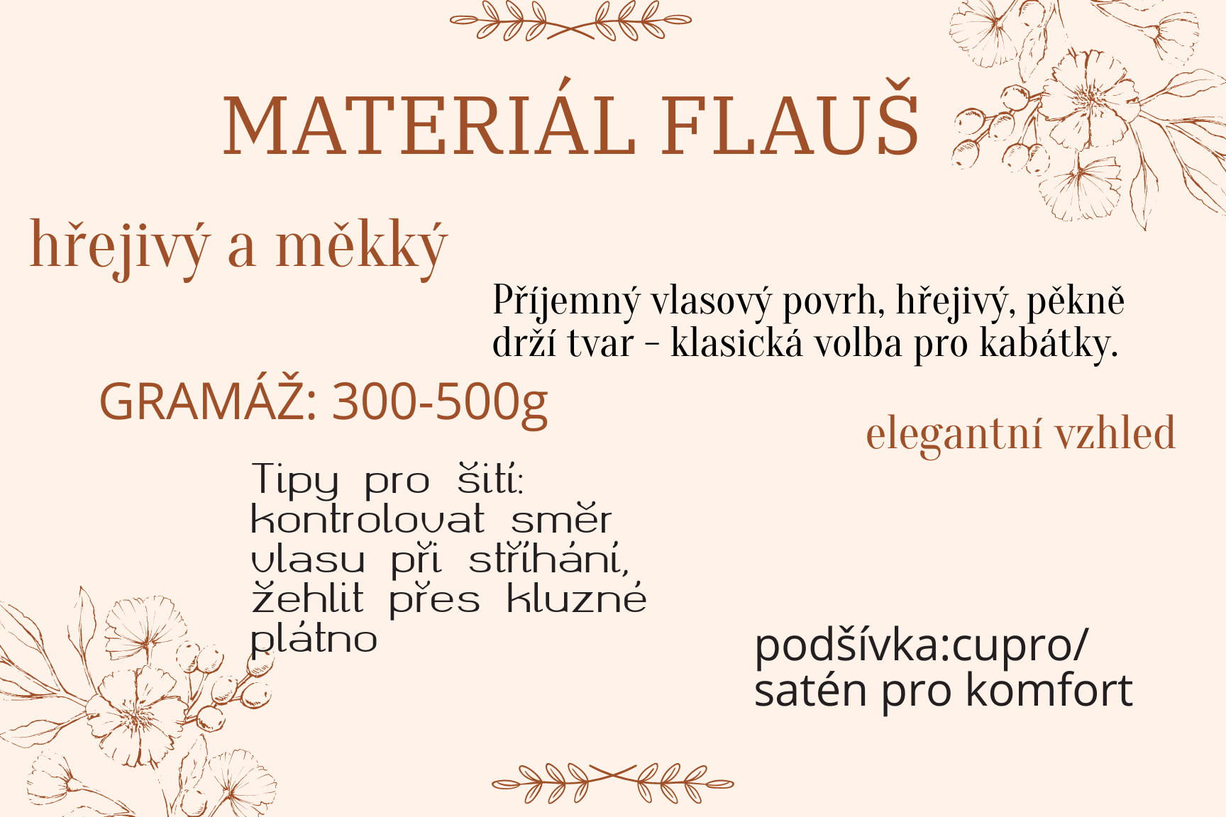 - Flauš: Tento materiál je měkký a teplý, ideální pro chladnější počasí. Flauš výborně padne a poskytuje elegantní vzhled.