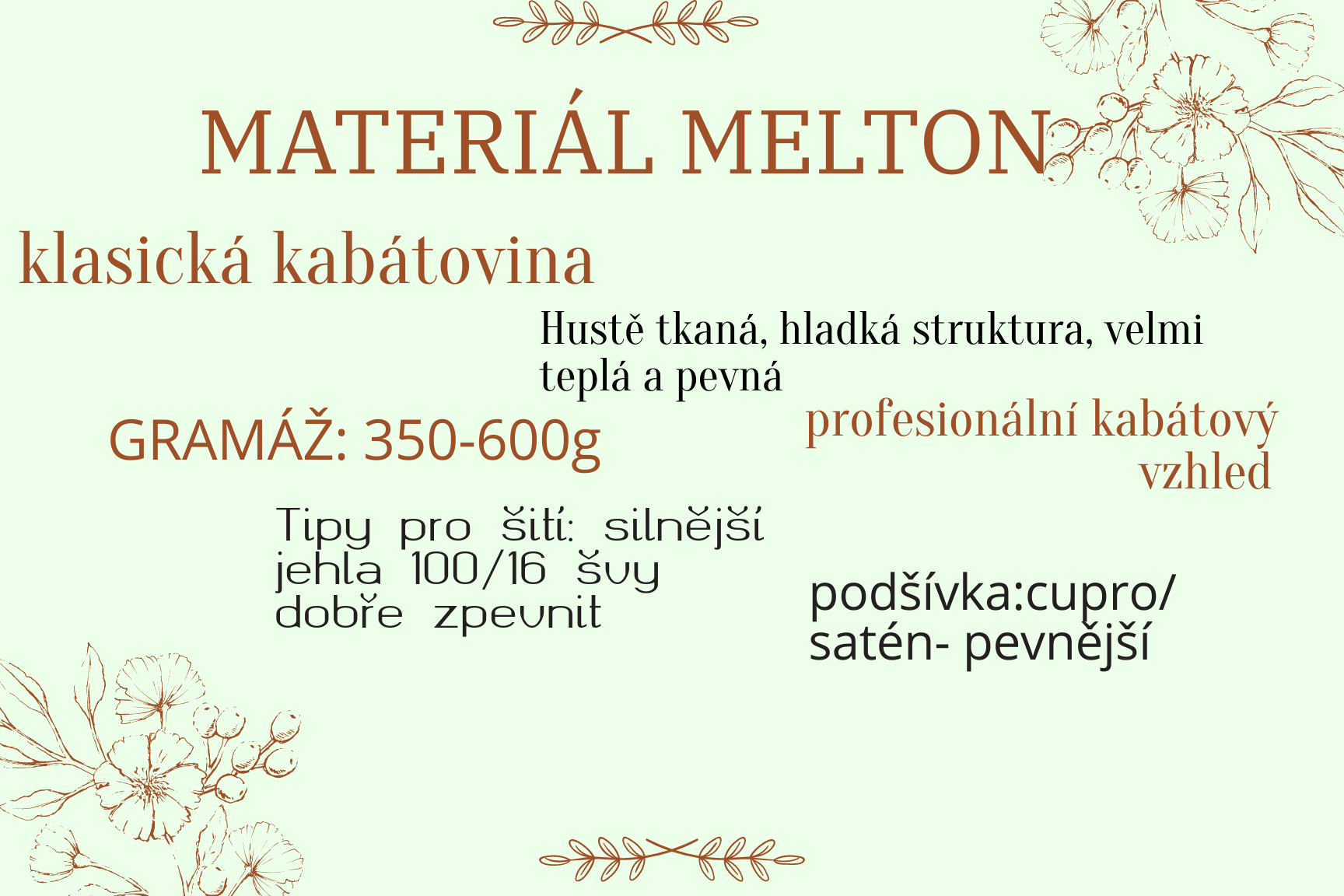 - Melton: Tento hustý a těžký materiál se vyznačuje skvělou tepelnou izolací a odolností proti větru. Melton je oblíben volbou pro podzimní a zimní oděvy.