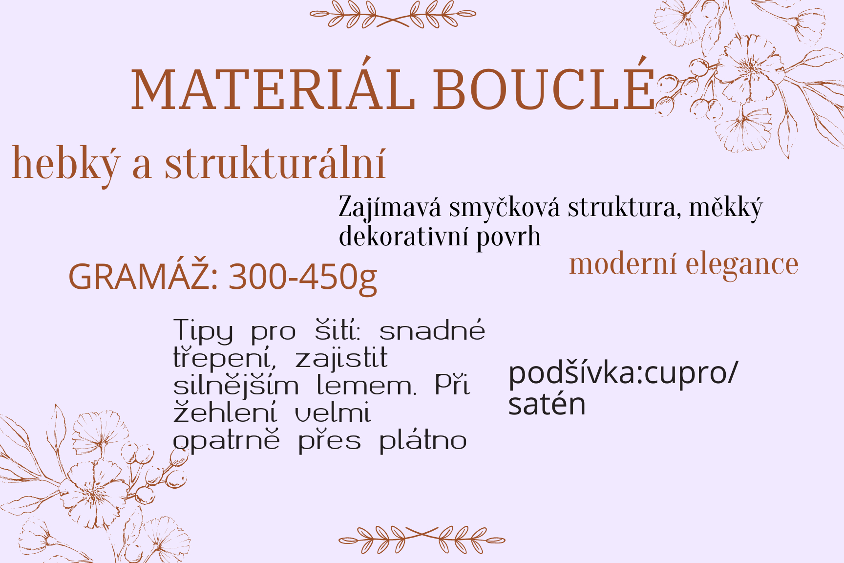 - Boucle: Boucle je strukturovaný materiál, který dodává kabátku objem a texturu. Jeho extravagantní vzhled skvěle ozvláštní jakýkoli model.